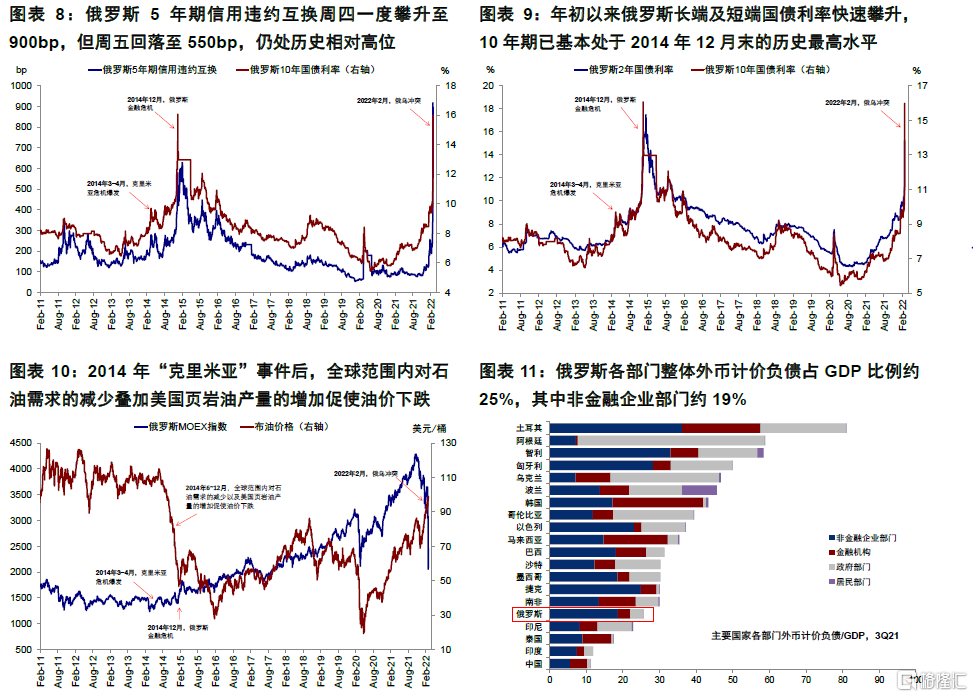 2014年“克里米亚”事件后,欧美国家同样对俄罗斯发起了“一揽子”制裁,包括停发签证、禁止实体交易、资产冻结、限制出口军事装备以及部分高科技设备等。回顾当时情形,“克里米亚”事件后,供应矛盾缓解、全球需求减少以及美国页岩油产量增加促使油价下跌(原油价格从2014年6月的115美元/桶降至2014年12月的47美元/桶),叠加欧美国家的经济制裁使得俄罗斯经济一度遭受重创。俄罗斯长短端国债利率也快速上行并分别于2014年末和2015初达到当时高位(10年期国债利率2014年12月末达16.1%;2年期国债2015年1月初为17.5%),俄罗斯5年期信用违约互换也一度升至600bp以上,俄罗斯股指也在2014年下半年下跌超55%。