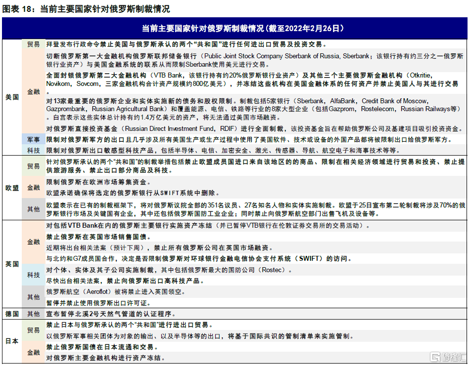 ►美国:冻结俄罗斯主要银行资产及限制融资交易、限制科技及军事领域相关出口等。具体包括,贸易方面,拜登发布行政命令禁止美国与俄罗斯承认的两个“共和国”进行任何进出口贸易及投资交易。金融方面,美国近日针对俄罗斯实施了广泛的金融制裁,主要限制俄罗斯金融体系的核心基础实施进行融资交易,并进一步将俄罗斯排除在全球金融体系之外。白宫表示此次针对俄罗斯的金融制裁将合计瞄准1.4万亿美元的资产规模,涉及俄罗斯银行业将近80%的资产。具体包括:1)切断俄罗斯第一大金融机构俄罗斯联邦储备银行与美国金融系统的联系从而限制Sberbank使用美元进行交易;2)全面封锁俄罗斯第二大金融机构及其他三个主要俄罗斯金融机构,并冻结这些机构在美国金融体系的任何资产并禁止美国人与其进行交易;3)对13家最重要的俄罗斯企业和实体实施新的债务和股权限制。制裁包括5家银行和覆盖能源、电信、铁路等行业的8家大型企业。白宫表示这些实体总计持有约1.4万亿美元的资产,将无法通过美国市场融资;4)对俄罗斯直接投资基金进行全面制裁(该投资基金旨在帮助俄罗斯公司及基建项目吸引投资资金)。