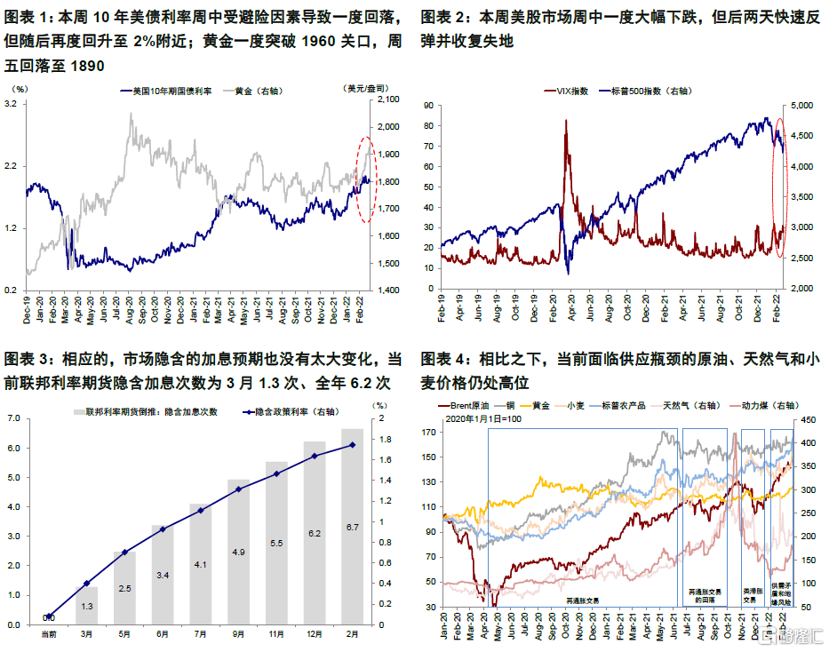 从预期角度,全球市场大跌又修复的表现,基本上是在交易冲突整体可控、制裁力度相对有限的预期,相应的3月份美联储加息预期的变化也不大。不过,也有一些资产并没有完全回到事件发生前,例如可能因此面临供给冲击的原油、天然气和小麦;10年美债中的通胀预期和1年期的通胀互换也是如此,都表明对于一部分资源品的供应扰动担忧依然存在。