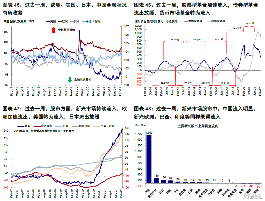 整体看,美元计价下,大宗>债>股;原油、全球REITs等上涨,俄罗斯股市、俄罗斯卢布领跌。板块方面,标普500指数中医疗设备、房地产、软件与服务领涨,汽车与零部件领跌。利率方面,10年美债利率同样波动剧烈,整体抬升3bp至1.93%,其中实际利率回落9bp,通胀预期抬升12bp。信用利差方面,美国投资级信用利差及高收益债信用利差均走扩,高收益债资金也继续流出。