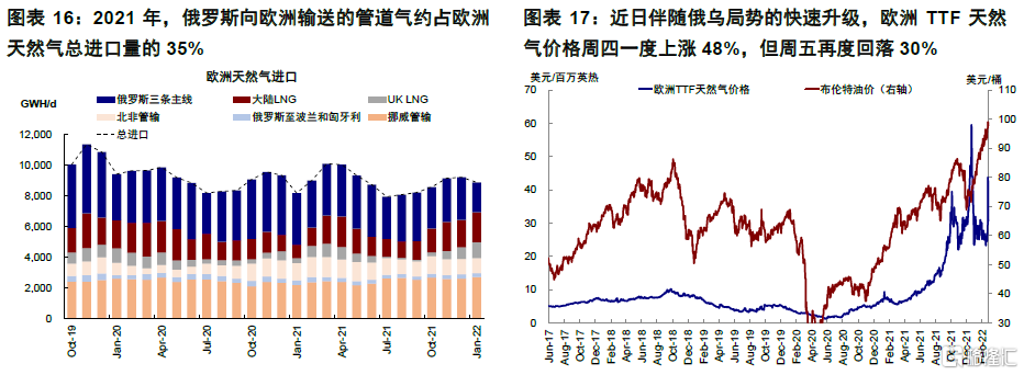 2)北溪2号暂停,欧洲仍面临较大的供应风险。近日随着俄乌局势快速升级,欧洲TTF天然气价格一度上涨48%、但周五再度回落30%。中金公司大宗组表示,虽然此前取暖旺季结束使得气价回落,但供应担忧扔不排除使得气价再度反弹。今年夏季需求小高峰之时,欧洲天然气市场可能面临短缺风险。不过,从另一个角度看,居高不下的能源价格和持续紧张的供给也有可能促使其他替代能源投入的增加;