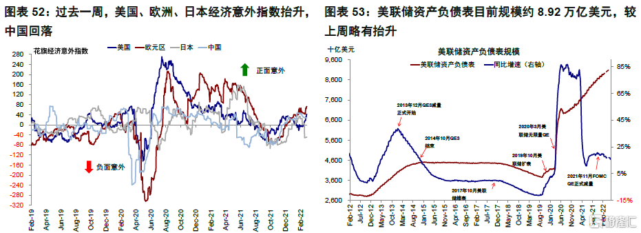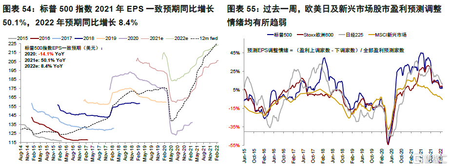 过去一周,美国、欧洲、日本经济意外指数抬升,中国回落。美联储资产负债表目前规模约8.92万亿美元,较上周略有抬升。标普500指数2021年EPS一致预期同比增长50.1%,2022年预期同比增长8.4%。