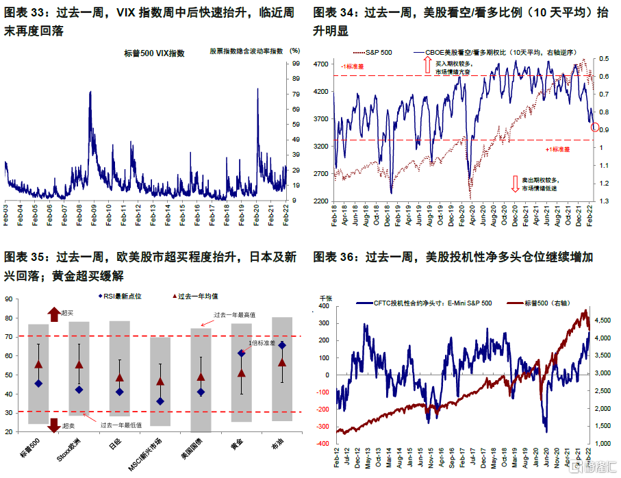 过去一周,VIX指数周中后快速抬升,临近周末再度回落,看空/看多期权比例(10天平均)抬升明显。主欧美股市超买程度抬升,日本及新兴回落;黄金超买缓解。仓位方面,美股、美元及黄金投机性净多头仓位继续增加,白银净多头仓位快速增加,10年美债净空头仓位有所减少,但2年期美债净空头仓位继续增加。