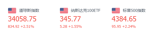 截止上周五收盘,道指下跌834.92点,涨幅为2.51%;纳指涨221.03点,涨幅为1.64%;标普500指数涨95.95点,涨幅为2.24%。