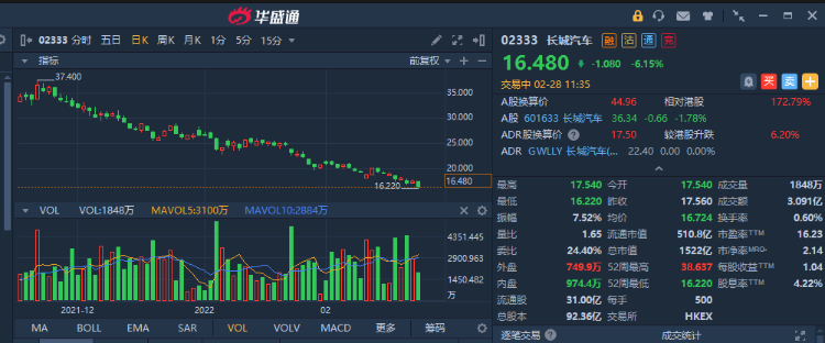 华盛资讯2月28日讯,部分汽车股走低,截至发稿,长城汽车跌超6%;小鹏汽车跌近3%;五菱汽车跌2.5%;广汽集团跌1.8%;理想汽车跌1.2%。