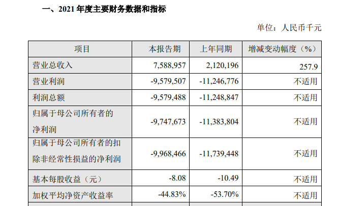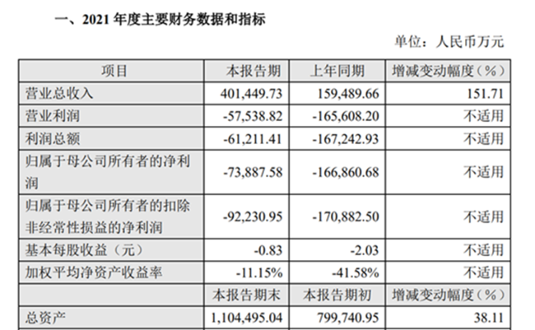 君实生物2021年公司营业总收入40.14亿元,同比增加151.71%,归属于母公司所有者亏损7.39亿,上年同期亏损16.69亿元,同比亏损减少。