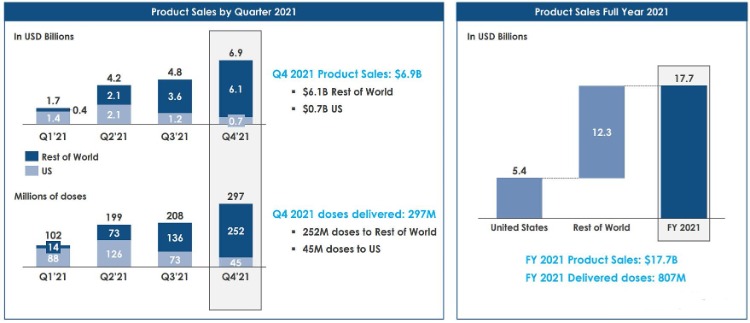 Moderna公布2021年第四季度业绩,财报显示,公司Q4营收72.11亿美元,市场预期为 67.1亿美元,上年同期为5.71亿美元;净利润48.68亿美元,上年同期录得净亏损2.72亿美元;基本每股盈利为12.03美元,摊薄后为11.29美元,市场预期为9.83美元;营收与盈利双双优于市场预期。
