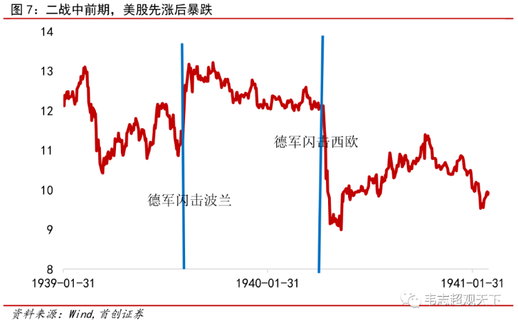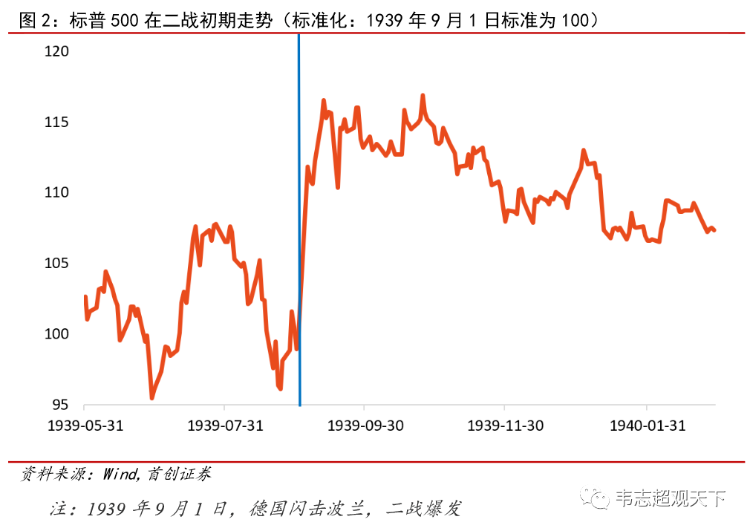 比如,1939年9月德军闪击波兰,二战爆发,直观的感觉是全球股市应该大跌。然而,现实的情况是英美的股市大涨,美股的涨幅还非常可观。我们猜测,当时的逻辑和当下的逻辑是有很大不同的。在全球化的今天,全球的物资流、资金流都高度相关,因此是牵一发而动全身,一荣俱荣一损俱损。因此对于战争事件,今天的全球股市基本是同涨同跌的。然而,二战前全球经济是相对割裂的,各国股市有一定的独立性。德军闪击波兰之后,舆论一度以为德国下一步要进攻苏联,英美等国能坐收渔翁之利,因此欧美股市反而上涨。因此,这个例子表明,我们不要拘泥于一般规律,而是要搞清楚战争影响的经济逻辑。
