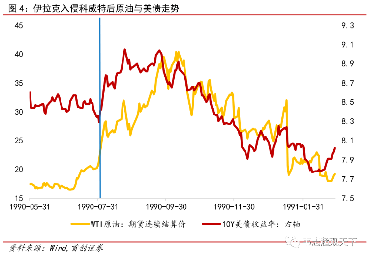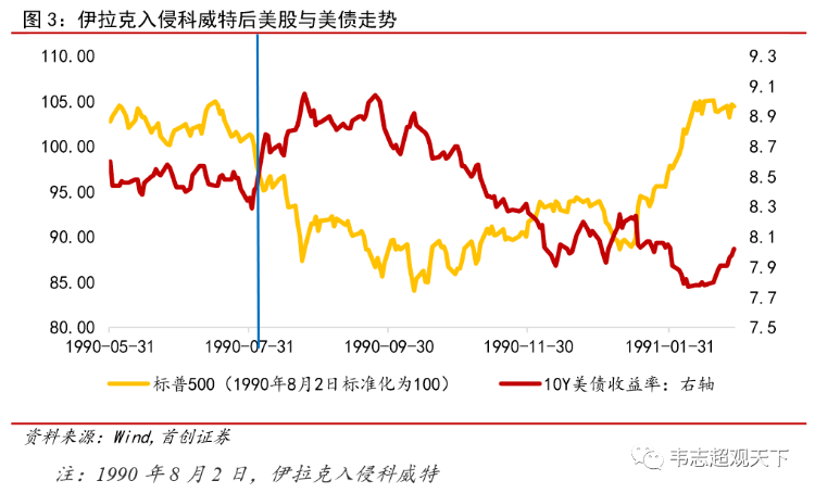 另外一个例子是海湾战争。1990年8月2日伊拉克进攻科威特,全球股市毫无意外的大跌,但国债收益率并没有体现如期下行,而是大幅上行,这与一般的规律是相悖的。究其原因,是因为中东打仗使得油价大涨,几乎翻倍,通胀预期大幅上行,从而导致债券收益率大幅上行。