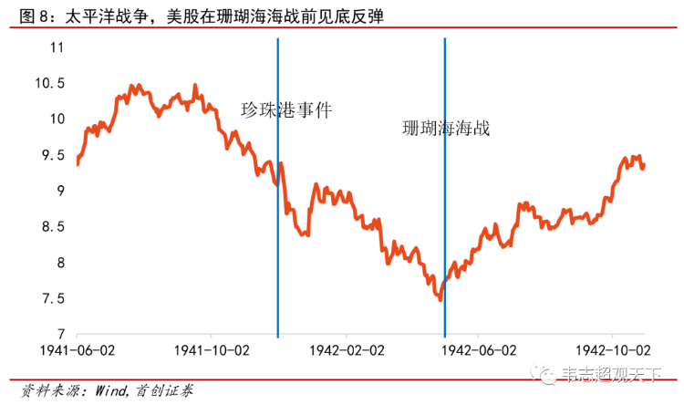 同样曲折的是太平洋战场期间的美股。珍珠港事件使美股遭到重创,但是很快就修复了大半,这是因为市场相信美国的实力比日本强很多,最终会取胜。然而,随后的太平洋战场上美军节节失利,但市场没有快速崩溃,而是持续阴跌,这是因为每次日军胜利之后市场总会认为下次美军会胜利。然而,这一趋势直到1942年5月的珊瑚海海战才结束。美军在太平洋战场第一次和日本打平手,随后见底反弹。这距离珍珠港事件已经半年了,等到完全修复则用了300天左右的时间。