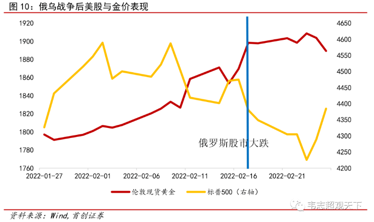 俄乌大战,引发全球高度关注,并震动全球资本市场。由于战争对资本市场的影响并不鲜见,因此国内外机构迅速有了相应的研究,并给出了大致的结论。最核心的一条是,战争对资本市场的冲击主要在短期,不改变中长期走势,典型的图请见图1。一条简单的推论就是,战争一旦开打,股市下跌反而是抄底机会,这从图1看非常明显。从最近一周的走势看,确实美股和黄金迅速触底反弹,修复失地。