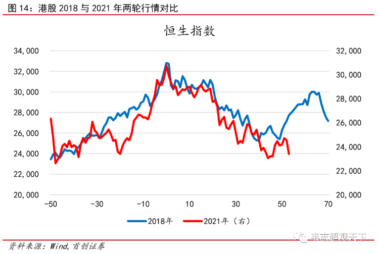 2)从2021-2022年股市走势与2018-2019年走势的对比上看,尽管A股经过一段时间调整之后,高估情况有所缓解,但上涨空间不大;港股因为2021年跌幅较深,距离合理价位仍有较大的修复空间。