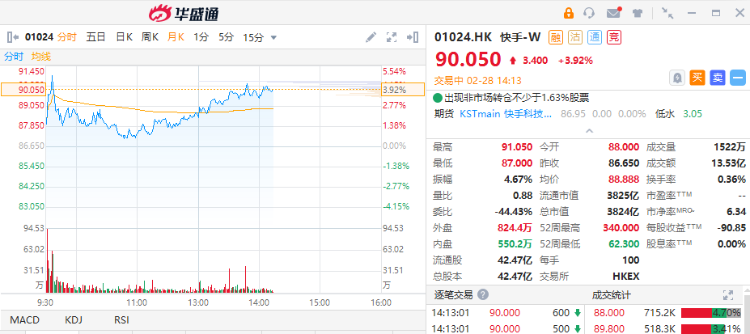 华盛资讯2月28日讯,快手午后涨幅扩大,截至发稿,现涨3.92%,报90.05港元每股,成交额13.53亿港元。