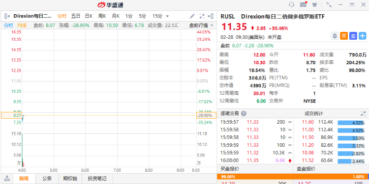 华盛资讯2月28日消息,美股盘前,俄罗斯概念板块盘前一度重挫,现跌幅收窄,Yandex(YNDX)跌近19%,二倍做多俄罗斯ETF-Direxion(RUSL)一度跌近30%,现跌幅收窄至22%;俄罗斯ETF-MarketVectors(RSX)跌近19%,iShares安硕MSCI俄罗斯ETF(ERUS)跌超16%。