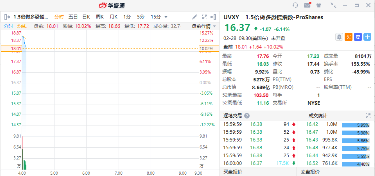 纳指期货跌幅收窄至约1%,标普500指数期货现跌1.3%,道指期货跌1.1%。1.5倍做多恐慌指数ETF UVXY 大涨超10%,纳斯达克指数三倍做空ETF SQQQ盘前涨近4%。