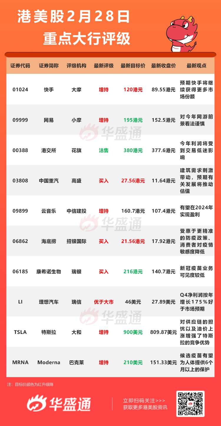 小摩发布研究报告称,维持网易-S“增持”评级,虽然网易去年第四季电脑游戏表现正面,但对今年网游前景看法谨慎,并下调其网游收入预测6%,虽然预期今年的营业利润率将有所上升,但仍将其目标价由200港元调低至195港元。