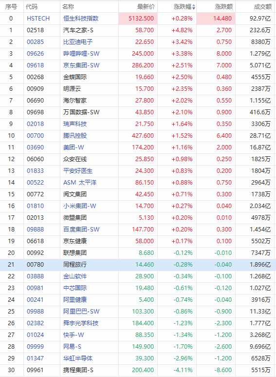 截至发稿,汽车之家涨近5%,比亚迪电子、哔哩哔哩涨超3%,京东集团、明源云、海尔智家涨超2%,腾讯控股近2%,瑞声科技、美团涨超1%。