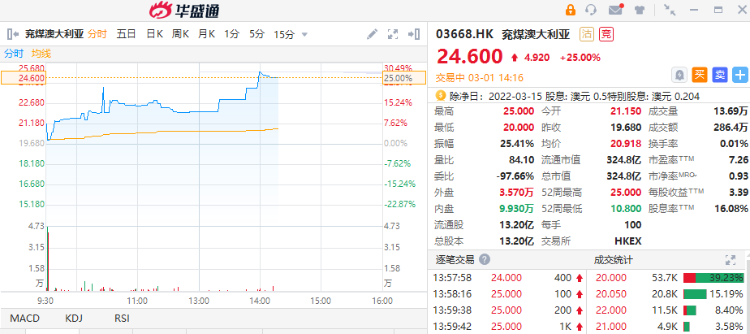 华盛资讯3月1日讯,港股煤炭概念股持续走高,截至发稿,兖煤澳大利亚涨25%,报24.6港元每股。