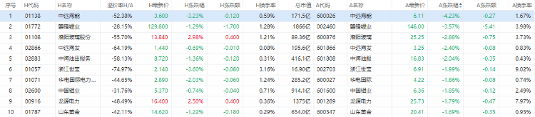 中远海能A股跌4.23%,H股跌3.23%,赣锋锂业A股跌3.57%,H股跌1.29%,洛阳玻璃股份A股跌2.88%,H股涨2.98%。