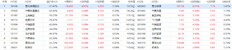 截至发稿,青岛啤酒股份A股涨8.31%,H股涨4.87%,中国交通建设A股涨6%,H股涨2.68%,上海复旦A股涨5.52%,H股涨3.58%。