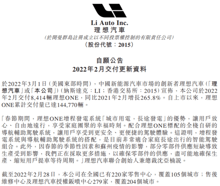 “春节期间,理想ONE增程发电系统‘城市用电,长途发电’的优势,让用户放心、自由地远行,享受家庭团聚的幸福时刻。配合理想ONE标配的全栈自研的导航辅助驾驶系统,让用户享受到更安全、更便捷的驾驶体验。这证明,增程发电系统与导航辅助驾驶系统的搭配,是目前非常适合家庭长途出行的智能驾驶组合。此外,因春节的季节性因素和苏州疫情的影响,部分零部件供应短缺导致生产受到影响,我们正在采取更多措施,以确保零部件的供应,尽可能地确保生产、缩短用户提车等待周期。”理想汽车联合创始人兼总裁沈亚楠说。