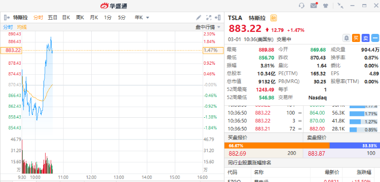 华盛资讯3月1日消息,美股盘中,特斯拉翻红,现涨超1%,此前一度跌超1%。