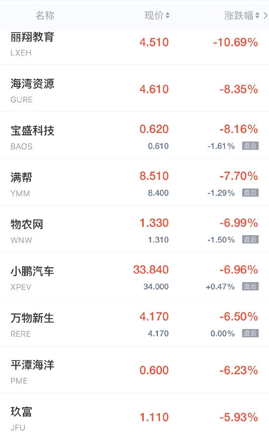 宝盛科技跌超8%,满帮跌超7%,万物新生跌超6%,亿航跌近6%,网易有道、高途跌超5%,优信跌超4%,人人公司跌近4%,新东方、凤凰新媒体、欢聚集团跌超3%,途牛跌近3%,知乎、云米科技、唯品会猎豹移动、世纪互联跌超2%,网易、一起教育、雾芯科技跌近2%,哔哩哔哩、拼多多、乐居、腾讯音乐跌超1%,虎牙跌近1%。