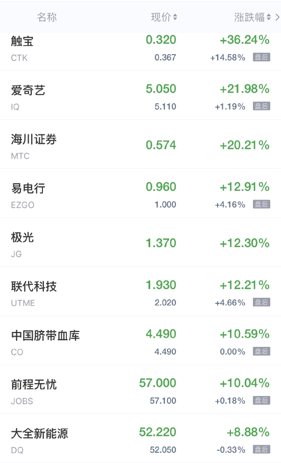 触宝涨超36%,爱奇艺涨近22%,海川证券涨超20%,易电行涨近13%,极光、联代科技涨超12%,前程无忧涨超10%,百度涨近7%,贝壳涨近5%,汽车之家涨近4%,趣头条涨超3%,搜狐涨近3%,京东涨超2%,斗鱼、阿里巴巴涨近2%,好未来、微美全息、名创优品涨超1%。