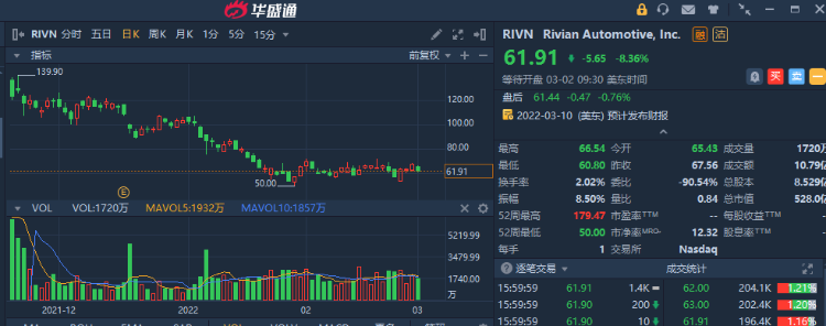 Rivian股价周二下跌8.4%,报61.91美元,盘后再跌0.76%。