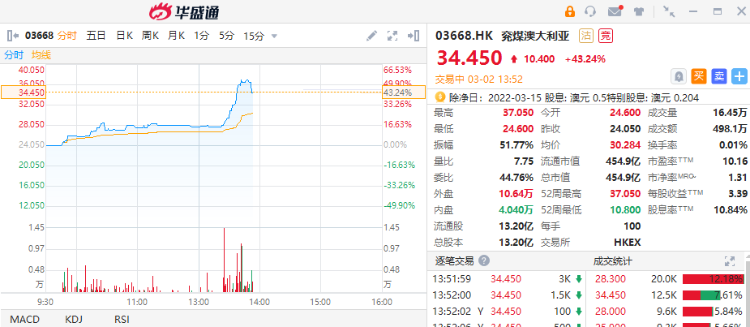 华盛资讯3月2日讯,昨日收涨超22%的兖煤澳大利亚今日持续走高,一度大涨超54%。截至发稿,现涨43.24%,报34.45港元,最新市值454.9亿港元。