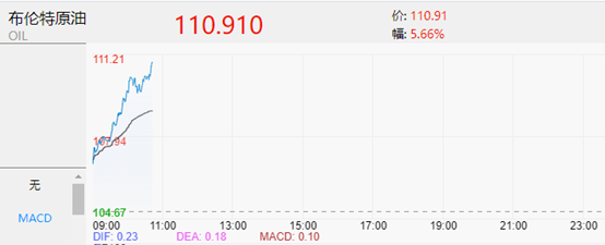 截至北京时间10:00,布伦特原油站上110美元/桶,续创2014年以来新高,日内涨超2.7%。WTI原油站上108美元/桶,日内涨超5%。