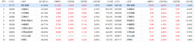 截至发稿,兖矿能源A股涨8.69%,H股涨4.18%,中国铝业A股涨8.65%,H股涨5.07%,中远海能A股涨6.22%,H股涨2.22%。