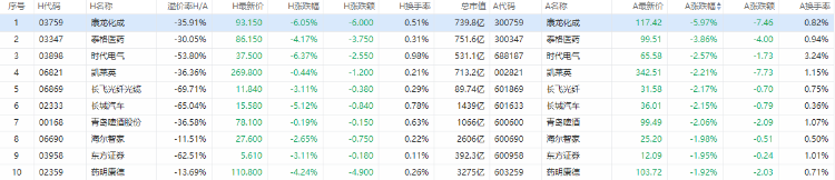 康龙化成A股跌5.97%,H股跌6.05%,泰格医药A股跌3.86%,H股跌4.17%,时代电气A股跌2.57%,H股跌6.37%。