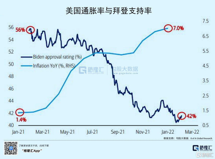随着通胀率从1.4%飙升至7.5%,拜登的支持率也从56%回落至42%。