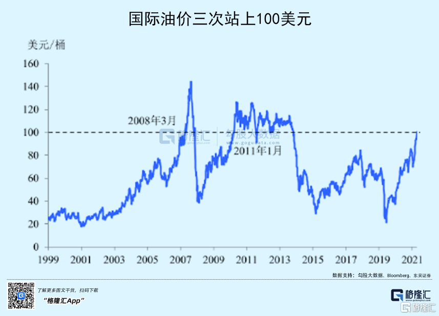 回顾历史,国家油价分别在2008年和2011年突破过100美元,同样都是有地缘政治危机火上浇油推动。而这两次油价在冲破100后,都没有立刻转头下跌。
