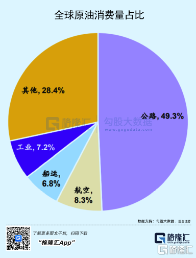 在原油消耗中,公路占比最高达49.35%,其次是航空、工业、船运,分别占比8.3%、7.2%、6.8%。