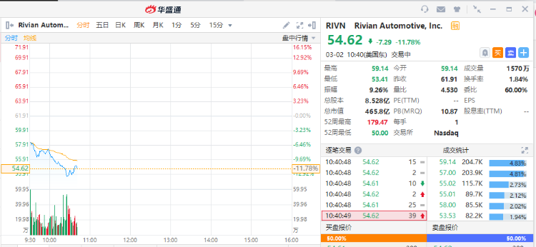 华盛资讯3月2日消息,美股盘中,美股新能源车板块走低,Rivian领跌,跌幅超11%。Lucid Group跌超5%,蔚来汽车跌超4%,Nikola跌超3%,特斯拉跌超1%。