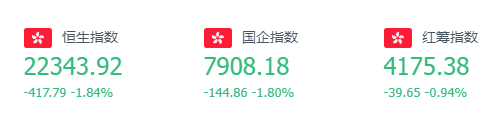 3月2日,港股恒指开跌0.85%,随后扩大跌幅。截至收盘,恒生指数跌1.84%,报22343.92点;国企指数跌1.80%,报7908.18点;红筹指数跌0.94%,报4175.38点。