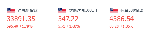 道指涨1.79%,报33891.35点;纳指涨1.62%,报13752.02点;标普500指数涨1.86%,报4386.54点。