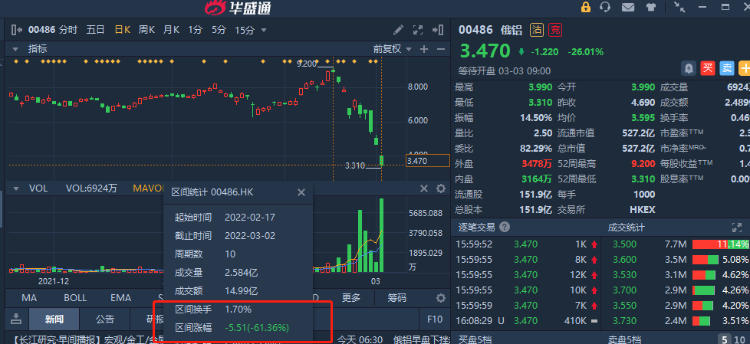 10.俄铝关停乌工厂,从2月高点已经狂跌60%。俄铝日前在港交所公告,由于黑海及周边地区不可避免的物流及交通挑战,不得不暂时关闭位于乌克兰Nikolaev地区的Nikolaev氧化铝精炼厂的生产。由于俄有色金属业企业均以出口为导向,市场对俄方产能输出担忧下,相关内地个股普涨。