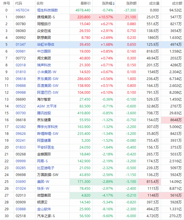 截至发稿,携程集团涨超10%,同程旅行涨超6%,联想集团、众安在线涨超2%,华虹半导体涨超1%。中芯国际、小米、京东、百度、阿里巴巴微涨。