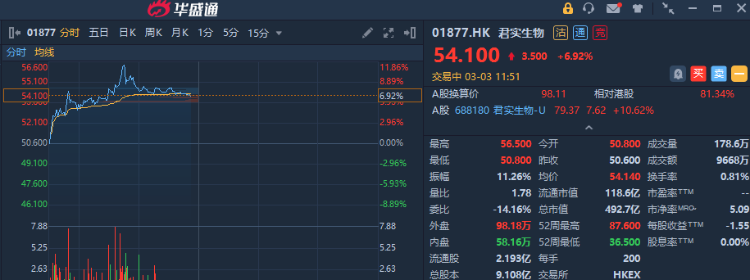 君实生物今日早盘一度涨逾11%,午盘收涨6.92%。公司发布公告称,从国家药品监督管理局网站查询获悉,与迈威生物合作开发的阿达木单抗注射液用于治疗类风湿关节炎、强直性脊柱炎及银屑病的药品上市许可申请已处于“审批完毕-待制证”阶段。该状态表示国家药监局已审批完毕,其相应行政部门正在制作药品注册批件。