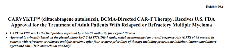 传奇生物公告称,其喜爱靶向B细胞成熟抗原(BCMA)的CAR-T疗法西达基奥仑赛(cilta-cel)的生物制品许可申请(BLA)正式获FDA批准,用于治疗复发/难治性多发性骨髓瘤(r/r MM)患者。这是首款获得FDA批准的国产CAR-T细胞疗法。这款药物的获批也是继百济神州泽布替尼之后中国创新药国际化取得的新里程碑和新突破。