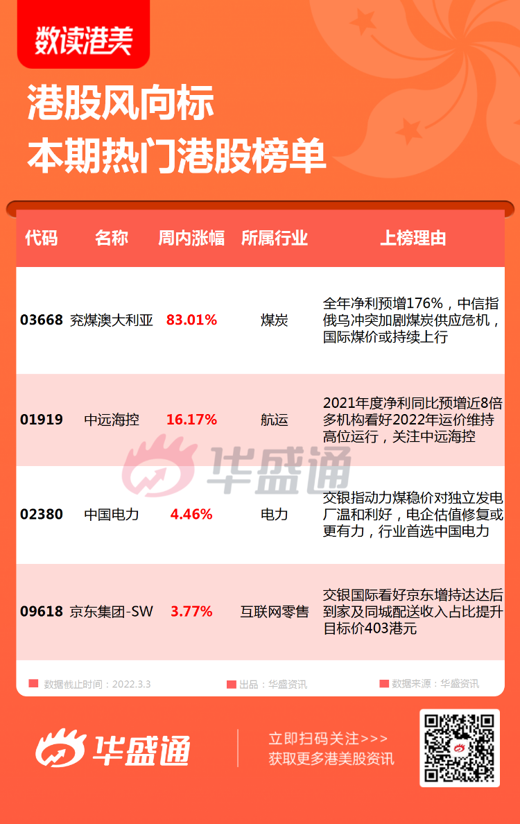 港股风向标丨业绩爆表,这只煤炭股一周暴拉83%!交银看好京东至403港元