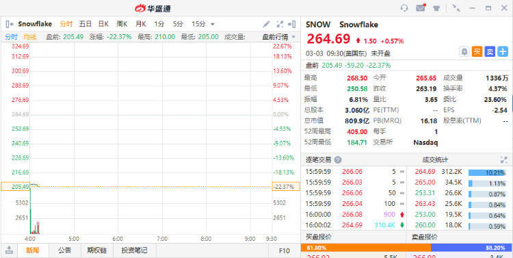华盛资讯3月3日消息,美股盘前,云计算巨头Snowflake盘前跌超22%,Q4营收增长101%,为2019年以来最低水平。巴克莱表示将Snowflake目标价从367美元下调至313美元。