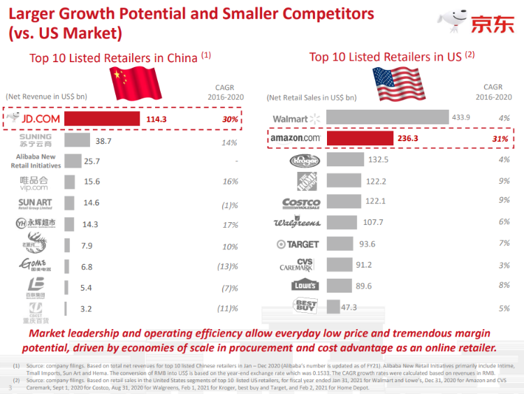 京东在零售方面的成绩也可圈可点。3月2日,德勤发布最新研究报告《2022全球零售力量》显示,2020财年(2020年7月1日至2021年6月30日)中国零售商首次跻身全球零售前十强。其中京东排名上升4位,位列第九位。