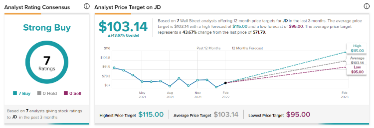据Tipranks,当前追踪京东的7名华尔街分析师中,7人全部给出了“买入”评级,平均目标价为103.14美元。