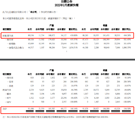 比亚迪股份发布2月产销报告:2月新能源汽车产量8.9万辆,上年同期1.17万辆;全年累计产量18.09万辆,同比增长430%。2月新能源汽车销量8.83万辆,上年同期1.04万辆;全年累计销量18.15万辆,同比增长494.28%。2月新能源汽车动力电池及储能电池装机总量约为4.615GWh,2022年累计装机总量约为9.385GWh。