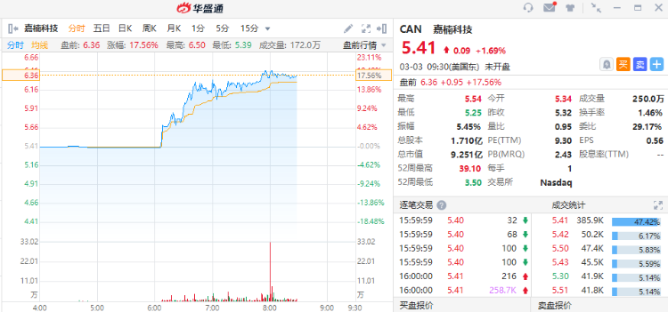 嘉楠科技$CAN 盘前大涨17% Q4收入同比增长56倍