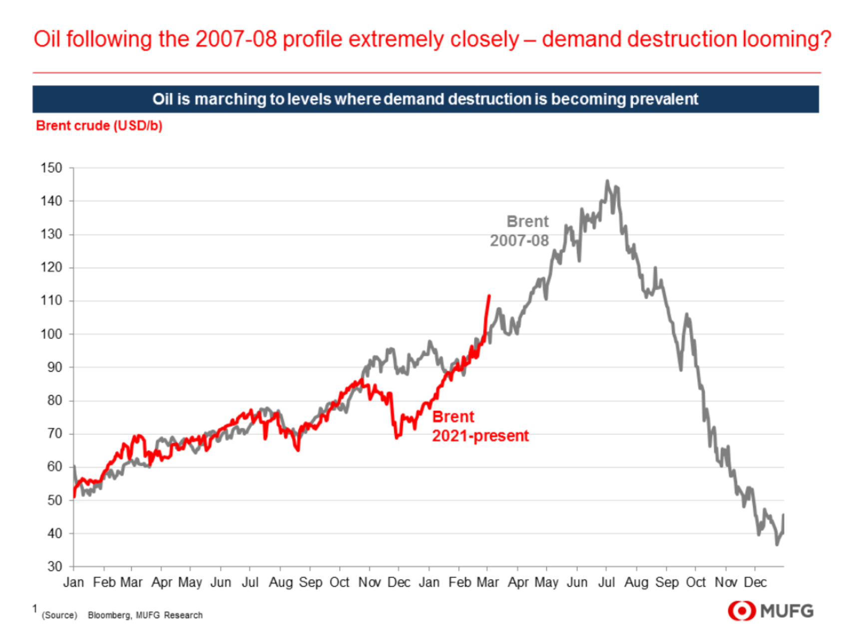 三菱UFJ金融集团(MUFG)分析显示,布伦特原油价格飙升的轨迹与2007-08年如出一辙,当时油价曾触及每桶150美元的创纪录高点,随后需求锐减,价格在全球经济衰退中暴跌。
